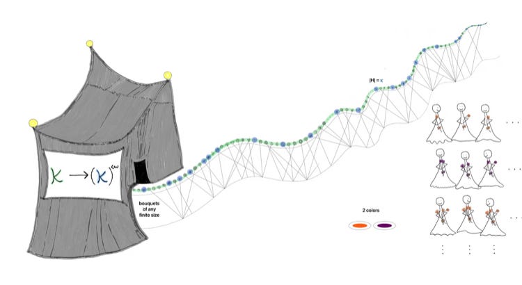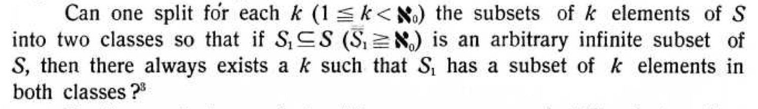If we look back a little further to a paper published in 1952 by Erdös and Rado called “Combinatorial theorems on classifications of subsets of a given set” they also begin with Ramsey’s theorem and write about an unsolved problem for cardinals larger than the continuum.