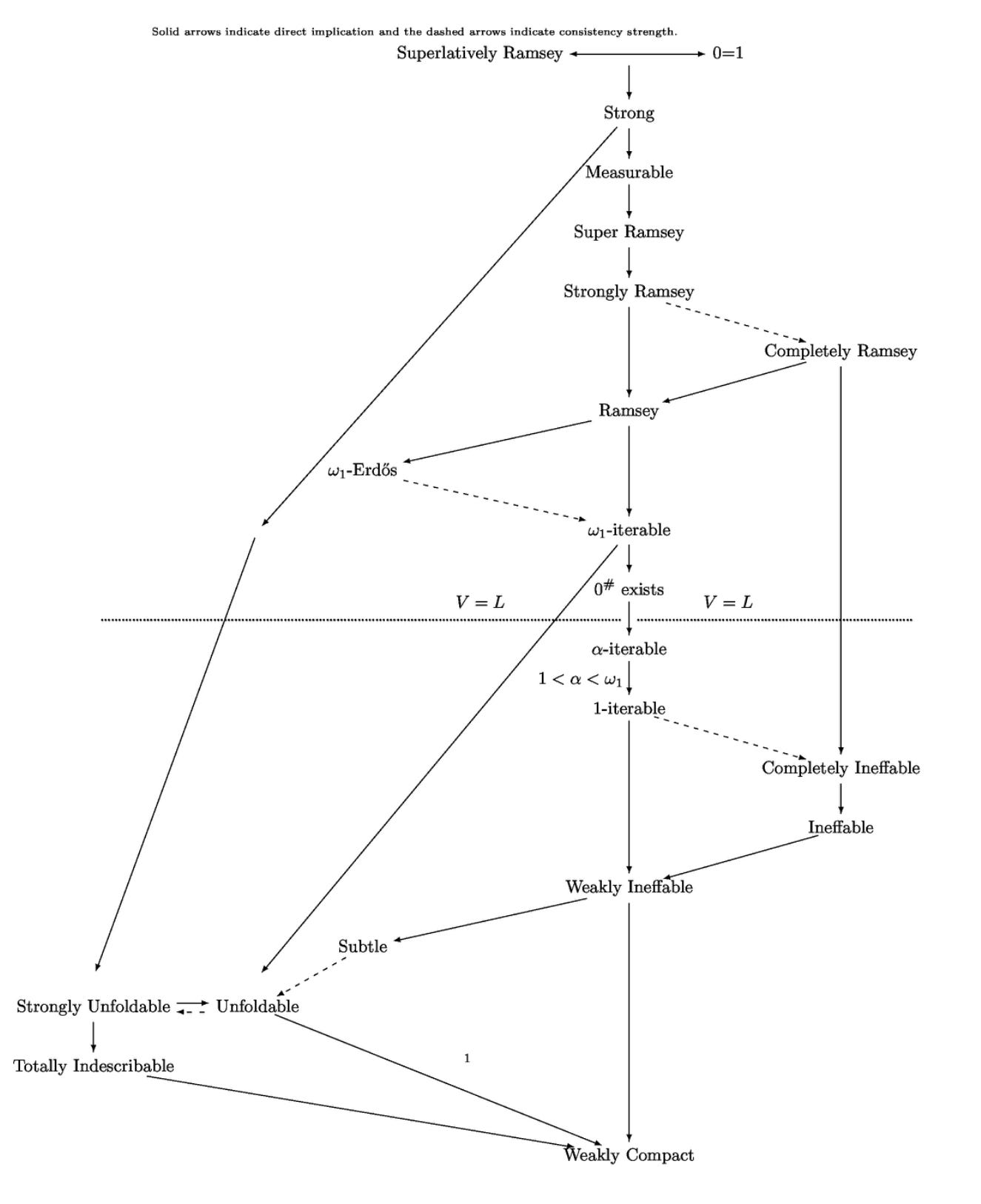 Since this time, there has been a lot of work done on developing definitions of large cardinals that extend the idea of a Ramsey cardinal. Here is a diagram created by Victoria Gitman that includes many of her “Ramsey-like” cardinals and how they fit into the large cardinal hierarchy.