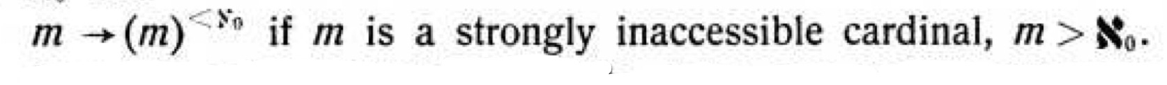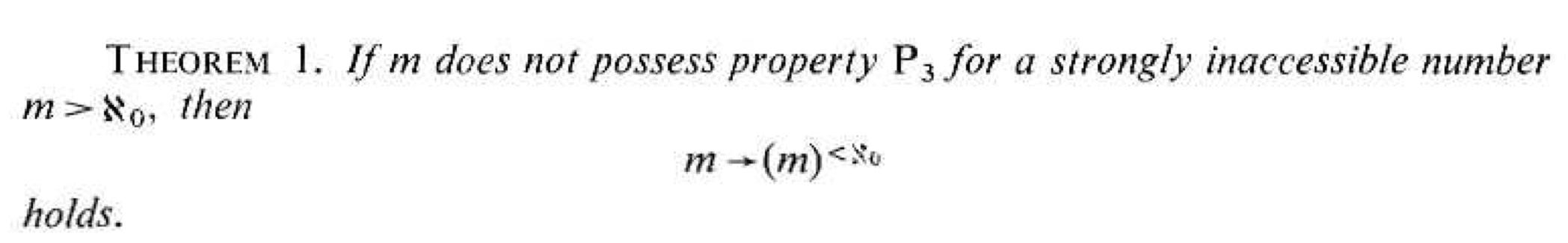 The property P₃ says that a cardinal is not measurable. So this theorem says that if m is measurable and m is inaccessible, then m is a Ramsey cardinal. At first, I thought the theorem was saying that if m is an inaccessible cardinal that is not measurable then it is Ramsey, which did not make sense. In my continued confusion, I asked a question on Mathoverflow, which was answered by Emil Jeřábek. I soon found out that Erdös and Hajnal had thought that strongly inaccessible cardinals were also measurable in the paper “On the structure of set mappings.” Once they realized that inaccessible cardinals are not necessarily measurable, they wrote “Some remarks on our paper…” where they showed that there are inaccessible cardinals that are not measurable. Also, since the Theorem 1 above is saying that if m is measurable and inaccessible then it is a Ramsey cardinal, it seems that they did not know that if a cardinal has the property of being a measurable cardinal then it is an inaccessible cardinal.